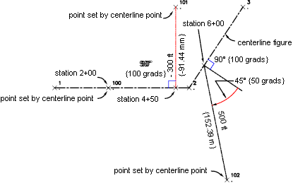 Point 100 is located at station 200 with a zero offset. Point 101 is located at station 450 with a left offset distance of 91.44. Point 102 is located at station 600 with a right offset distance of 152.4 and a skew angle of 50.