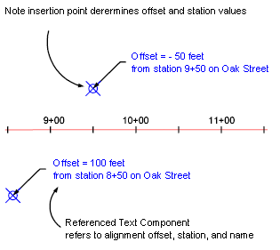 The insertion point of a Note label can be used to identify location-based Referenced Text data. For example, in the following illustration, the insertion point determines the station and offset values that appear in the label.