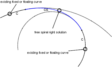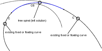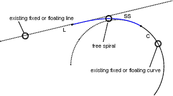 Use this command in situations where you need to create a single compound spiral solution as a transition between two curves with different radii. Because free spirals have only one geometric solution, you cannot specify length or A value. The program makes the calculation.