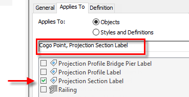 For example, to label Autodesk Civil 3D point projections in section views with property set data, you would select Projection Section Label and Cogo Point on the Applies To tab of the Style Manager when setting up the property set definition: