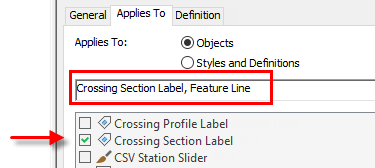 For example, to label feature line crossings in section views with property set data, you would select Crossing Section Label and Feature Line on the Applies To tab of the Style Manager when setting up the property set definition: