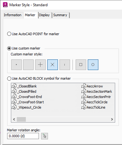 Marker styles can be set up to use AutoCAD points, custom marker symbols, or blocks.