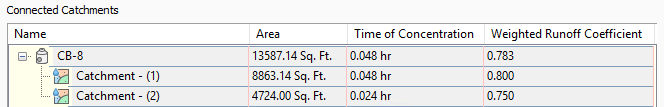 Displays the runoff coefficient of each catchment and the weighted runoff coefficient for all of the connected catchments.