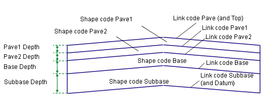 The standard link codes from top to bottom are Pave, Pave1, Pave2, Base, and Subbase. The code Top is also assigned to all finish grade links, thus coinciding with the Pave links on paved sections. The code Datum is also assigned to the bottom of subbase. The shape codes for the material areas from top to bottom are Pave1, Pave2, Base, and Subbase.