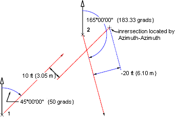 | azimuth 1, azimuth 2 | The azimuths for the lines from the existing points (point 1 and point 2). Azimuths establish a direction for each vector and are expressed in current angle units. |