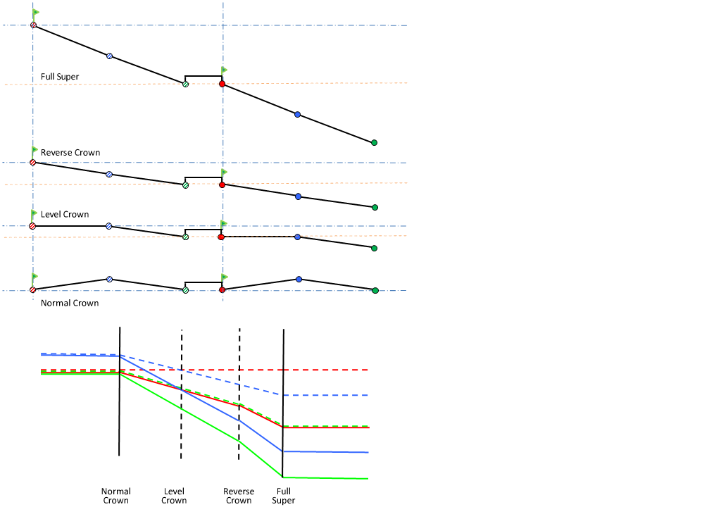 For an explanation of superelevation diagrams, see About Superelevation Axis of Rotation Pivot Methods.
