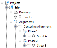 You can organize your project objects within subfolders by using Autodesk Vault. The subfolders are displayed in Prospector if they contain a project object. The following illustration shows two subfolders for project alignments in Prospector that exist within the Centerline Alignments folder.