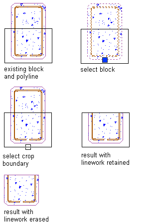 . All of the originally selected linework outside the crop boundary is erased. If you choose to erase the crop boundary, boundaries are redrawn for any closed-boundary entities inside the crop area. But any open-boundary objects that have been cropped remain open.