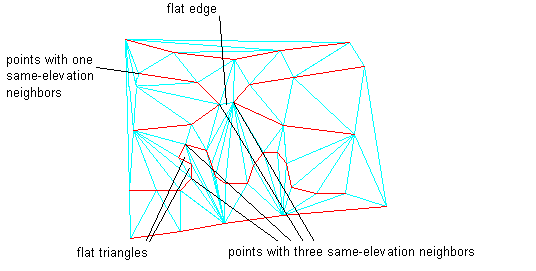 The multiple contours condition, which occurs when a point has more than two neighboring points with the same elevation, generally happens in a flat area of the surface. When this condition is detected, you can use the Minimize Flat Areas operation to correct the problem. If the point is on the surface border, the flat area can simply be an unintended artifact of the triangulation process. You can remove these unintended triangles by using the Delete Line operation or by adding a hide boundary.