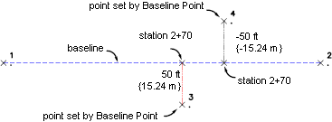 Point 3 is offset a distance of 15.24 to the right of the baseline at Station 2+20 and Point 4 is offset a distance of 15.24 to the left of the baseline at Station 2+70. Distances are in the current units, unless you type a qualifying suffix.