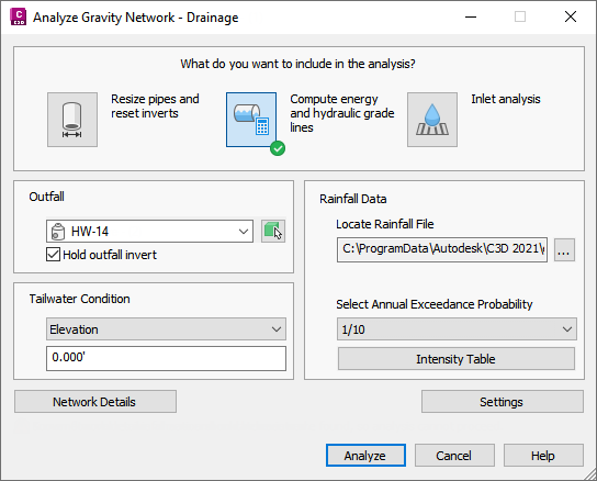 Use this page of the dialog box to specify the analysis types to run, the outfall part and the tailwater condition, and the rainfall data.