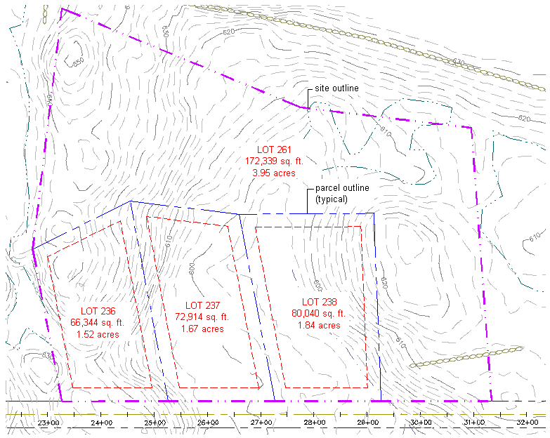 The site parcel has an area label, which you can hide or show. You can control the color and line type of the site parcel boundary, and you can control its draw order relative to the boundaries of the parcels that it encloses.