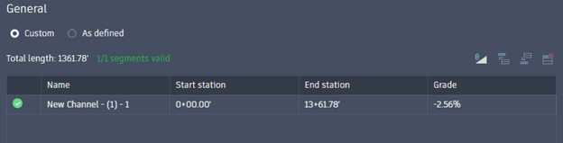 Grade. Displays the grade of each channel segment. This is represented as a percent grade and will read Horizontal if no slope exists. A negative grade represents a downward slope along the stationing.