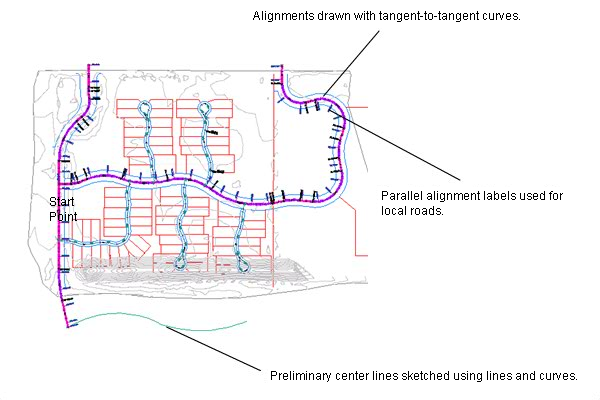 Alignment objects can represent road centerlines, pipe networks, and other construction baselines. Creating and defining a horizontal alignment is one of the first steps in roadway, railroad, or site design. You can draw the alignment geometry as a polyline, and then create the named alignment from that geometry. For greater control, you can create an alignment object using the Alignment Layout Tools. You can also make edits to alignments using grips, or the commands on the Alignment Layout Tools toolbar, while automatically maintaining tangency between the alignment components.