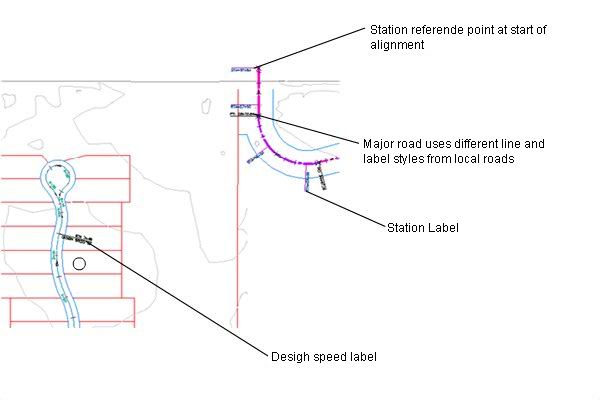 Control the visual appearance of alignment components and labels through styles. You can create specific styles to use in the various phases of a project. When you create an alignment, you specify a style for the alignment object and styles for the alignment labels. In the Alignment Labels dialog box, you can create groups of styles for alignment labels, and then save those labels as a label set to use with other alignments.