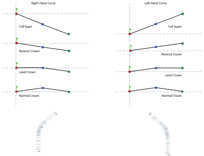 For an explanation of superelevation diagrams, see About Superelevation Axis of Rotation Pivot Methods.