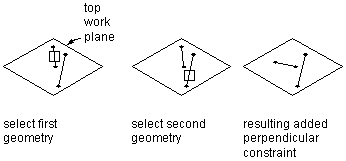 Can be defined between a line or curve and a curve. (Two lines cannot be made normal; a perpendicular constraint must be used instead.) The curves intersect and the directions of curve tangents are perpendicular at the point of intersection. A common use is constraining a line to the normal of an ellipse.