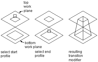 A transition modifier creates a transition body between two profiles. A transition includes both a start and end profile, which cannot be in the same work plane. Point references are useful to ensure that the profiles align between work planes; however, the centers do not need to align.