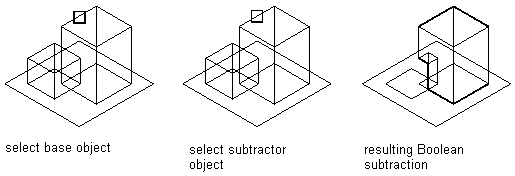 A Boolean subtract modifier subtracts one or more features from another to create a new feature. The Boolean subtract modifier uses a basic formula when creating the resulting feature: that the subtractor objects are removed from the base object. To see results in the model, the subtractor features must intersect with the base feature. When no intersection of features exists, the subtractor features are removed from the base feature with no visible change in the model.