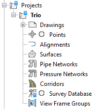 A project contains collections of project objects, such as surfaces, alignments, profiles, pipe networks, pressure networks, and view frame groups, that can be shared with others. All shared project objects are listed in the project object collections in the Prospector tree. Project members can create a read-only copy of a project object, called a reference, in a drawing. This read-only copy of the project object’s geometry can be used to perform labeling, design, analysis, or what-if tasks.