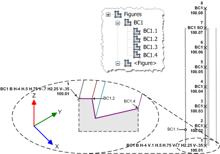 Point 101: BC1 is the line feature name, " " (Space) is the Feature/Code delimiter, B is the <Begin> code, H is the <Horizontal offset> code, -4 is the value for the first horizontal offset value, V is the <Vertical offset> code, .1 is the first vertical offset value, and so on for each of the remaining 3 offsets. Points 112, 123, 134, 145, and 156: BC1 figure with current offsets are continued. Point 167: BC1 is continued, but the offset figures are stopped by the SO <Stop offsets> code. Point 178: BC1 is continued. A value must follow the Horizontal offset code. A negative value offsets the active figure to the left and a positive value offsets the active figure to the right. Multiple offsets can be used, but if subsequent horizontal or vertical transitions are made, all previous horizontal offset or vertical offset codes must be specified for each offset. |