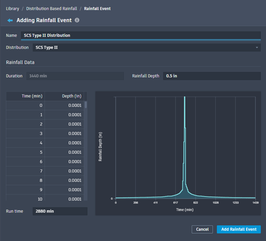 - (Optional) Adjust the Run time for the rainfall distribution. The default is twice its preconfigured Duration.