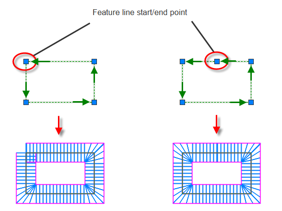 To work around this, it is recommended that you draw the feature line so that it starts and ends at a location other than a corner as shown in the following illustration on the right.