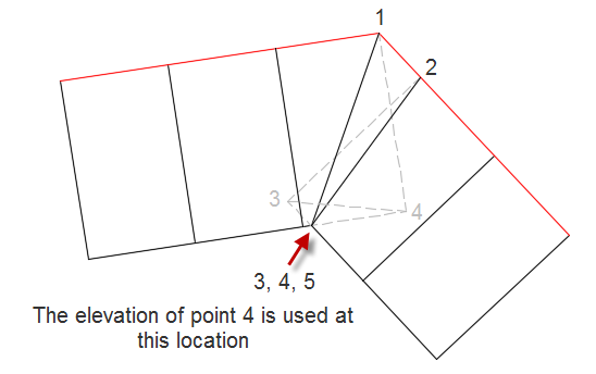 Points 3 and 4 are moved to the location of point 5, and the elevation of point 4 is now used in that location. The locations and elevations of points 1 and 2 are unchanged.
