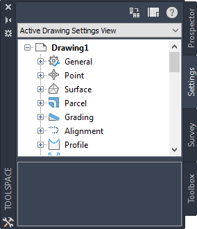 You can use the Settings tab to manage styles for Autodesk Civil 3D objects and to control settings for drawings and commands.