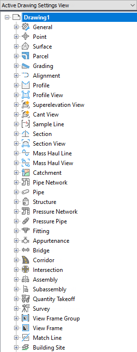 Use the Settings tree to manage object, label, and table styles and to control settings for drawings and commands.