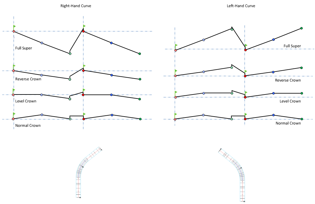 For an explanation of superelevation diagrams, see About Superelevation Axis of Rotation Pivot Methods.