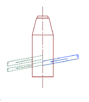 The following illustration shows a junction structure that has two outgoing pipes already connected to it on the left side of the structure. A new outgoing pipe is added to the right side of the structure. The pipe cover and slope rule determines the optimal connection elevation for the new outgoing pipe.