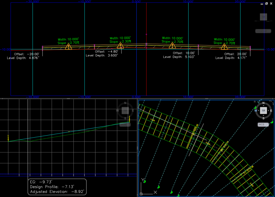 When you select a rehab region within a rehab corridor, three default viewports will be displayed, allowing you to view the corridor cross section for the station (cross section view), the vertical profile for the section (profile view), and the location of the corridor cross section along the rehab corridor's alignment (plan view).