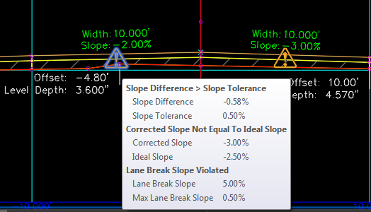 If the difference in accepted slope between two lanes is greater than the maximum lane break slope, a violation is displayed.