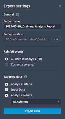 - Currently selected will export the Rainfall Event specified at the top of Analysis Results.