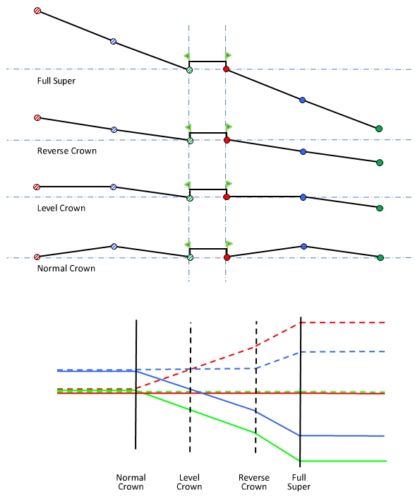 - A typical superelevation view for each case. The colored and dashed lines in the superelevation view correspond to the dots in the cross sections.