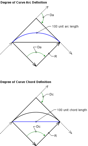 - Arc Definition: Specifies that the degree of curvature is determined by the arc. Use this option if the curve is a roadway curve. For a roadway curve, the degree of curve is the central angle subtended by a circular arc of 100 units.