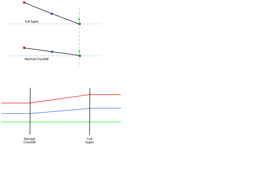 For an explanation of superelevation diagrams, see About Superelevation Axis of Rotation Pivot Methods.