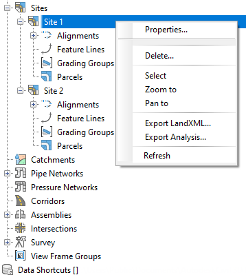 Certain site properties are specific to the Parcels collection within a site. These properties include site parcel style, site area label style, parcel style display order, area, perimeter, and frontage.