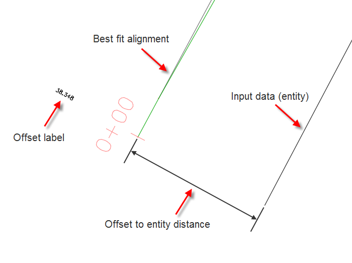 The labels show the positive or negative horizontal offset distance from the best fit alignment to the input data (entities). A positive value indicates that the input data is on the right of the best fit alignment (when starting at station 0+00), and a negative value indicates that the input data is on the left of the best fit alignment.