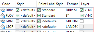 If the leading element in the raw description for the point matches a description key code, the point style, the point label style, and the layer specified in the description key are used to create the drawing point. The raw description you entered is translated into a full description using the format specified in the description key. If the raw description includes scaling and rotation information, the point symbol is scaled and rotated as specified.