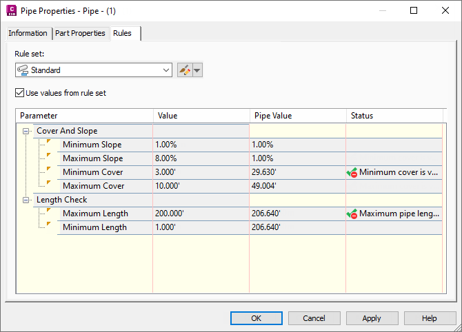 If you wish to resolve a broken rule condition, there are a few different ways you can do this. You can edit the value in the Value column (editing the rule). You can also edit the pipe or structure object itself in the drawing so that it no longer violates the rule. For example, you could move a pipe to a different elevation so that it no longer violates a Minimum Cover rule. In some situations, you may want to reapply rules to a pipe network, or to pipe network parts, when you have a rule violation.