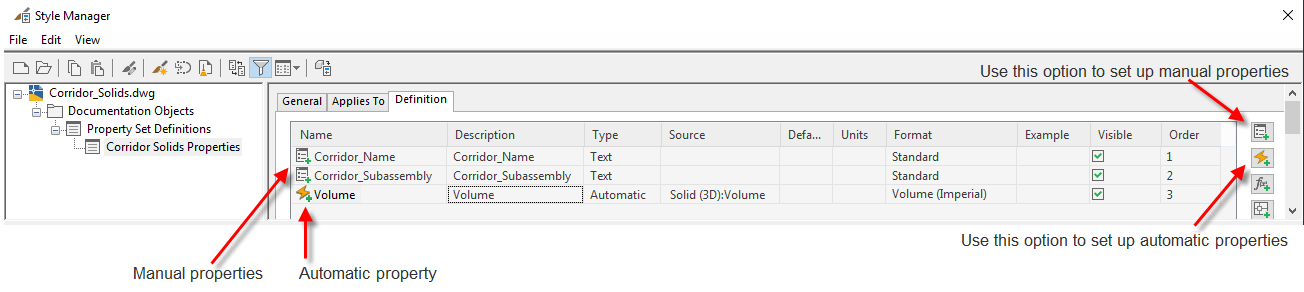 Create a new property set and set up manual and automatic properties to associate with the objects.