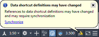 Data references are synchronized automatically when the drawing is opened. Otherwise, flags appear in the Prospector tree and the status bar of the drawing window when a reference object is out of date.