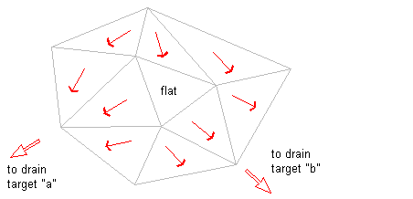 In the following illustration, the flat area, plus whatever part of the surface flows down to it, becomes a flat area watershed. This watershed is ambiguous because water flowing through it can flow to more than one drain target, “a” and “b”: