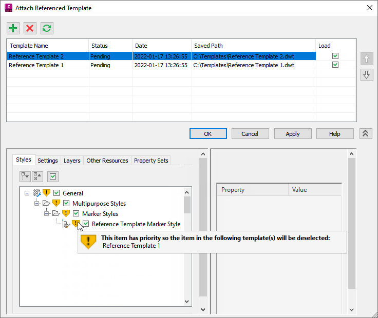 When you click Apply or OK, the styles and settings are applied, duplicates are de-selected in the lower priority templates, and the alerts are cleared.