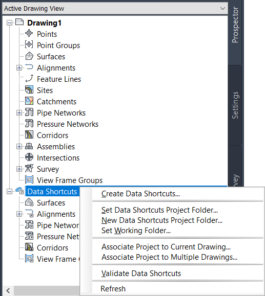 - In Toolspace, on the Prospector tab, right-click the Data Shortcuts node