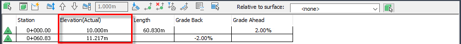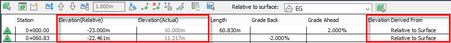 If it is changed to be relative to surface EG, the actual elevation stays the same and the Elevation (Relative) column shows the elevational difference between the feature line and the surface.