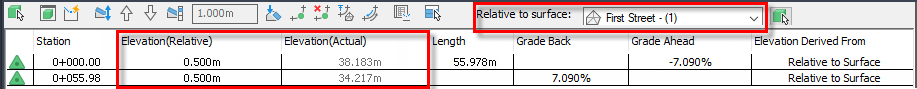 If the surface is changed to First Street, the values in the Elevation (Relative) column are applied now to First Street surface elevations to result in the new elevations in the Elevation (Actual) column.