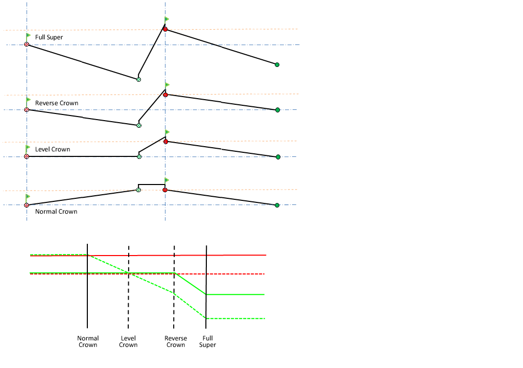 For an explanation of superelevation diagrams, see About Superelevation Axis of Rotation Pivot Methods.